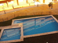 urbanización con piscina y jardín comunitario.