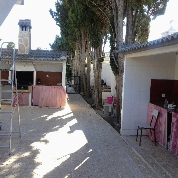 pavimentado y otra con árboles, zona de aparcamiento para varios vehículos, perrera, 2 barbacóas, tiene acceso por dos calles diferentes.